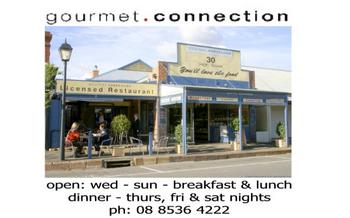 gourmet connection, open Wednesday - Sunday, Breakfast and lunch, dinner Thursday, Friday & Saturday nights. We are a licensed restaurant, cafe providing extensive variety of local wines. We offer, modern cuisine, alfresco dining, woodfire with a great atmosphere. We cater for private functions and small conferences.