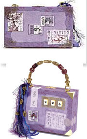 Paris painted the box lavender for a soft base color, then lightly sponged purple paint onto the surface for dimension. She tore two 6"x4" rectangles of lavender textured paper and glued one to the front and one to the back of the purse. She glued torn writing, character definitions and a stamp to the front, then wrapped a cut-out maze image onto the lower right corner for depth. The mah-jong tiles glued to a mica panel become an alluring focal point. Paris glued brass corners to the purse front for an elegant way to balance the embellishments with the glass and brass beadedhandle.